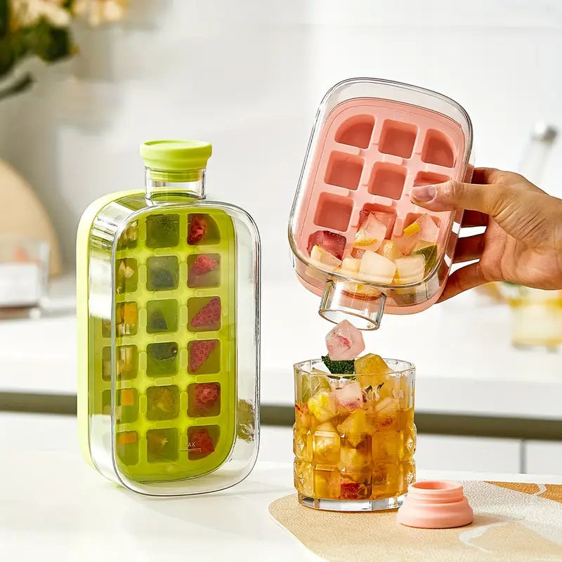 【Release lce with One Click】Simply press gently to release the ice cubes. This 2 in 1 ice cube bottle is designedwith an opening mouth at the top, so that the ice cubes can be easily pouredout after they are released, which ensure “zero” contact, and you can use theice cubes according to your needs.