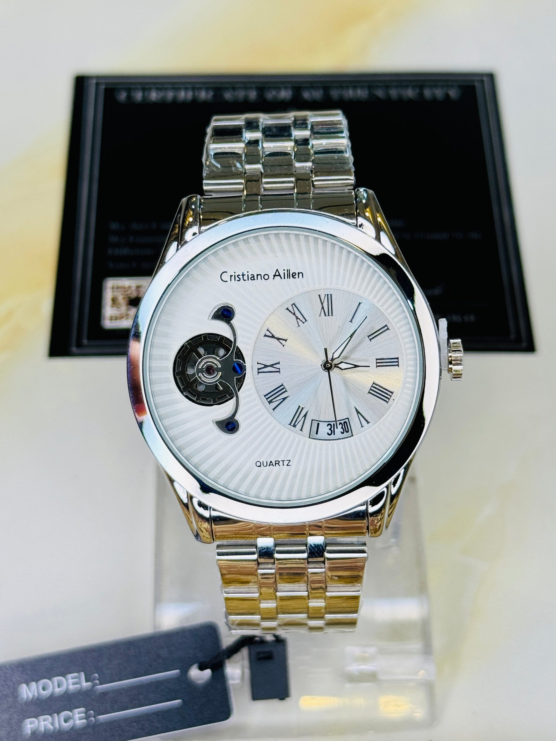Silver Cristiano Aillen White Spiral Gear Dial Watch