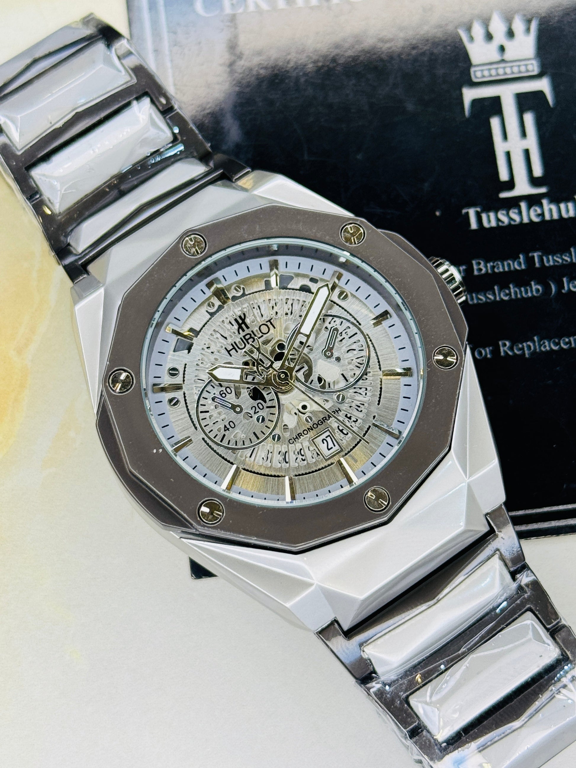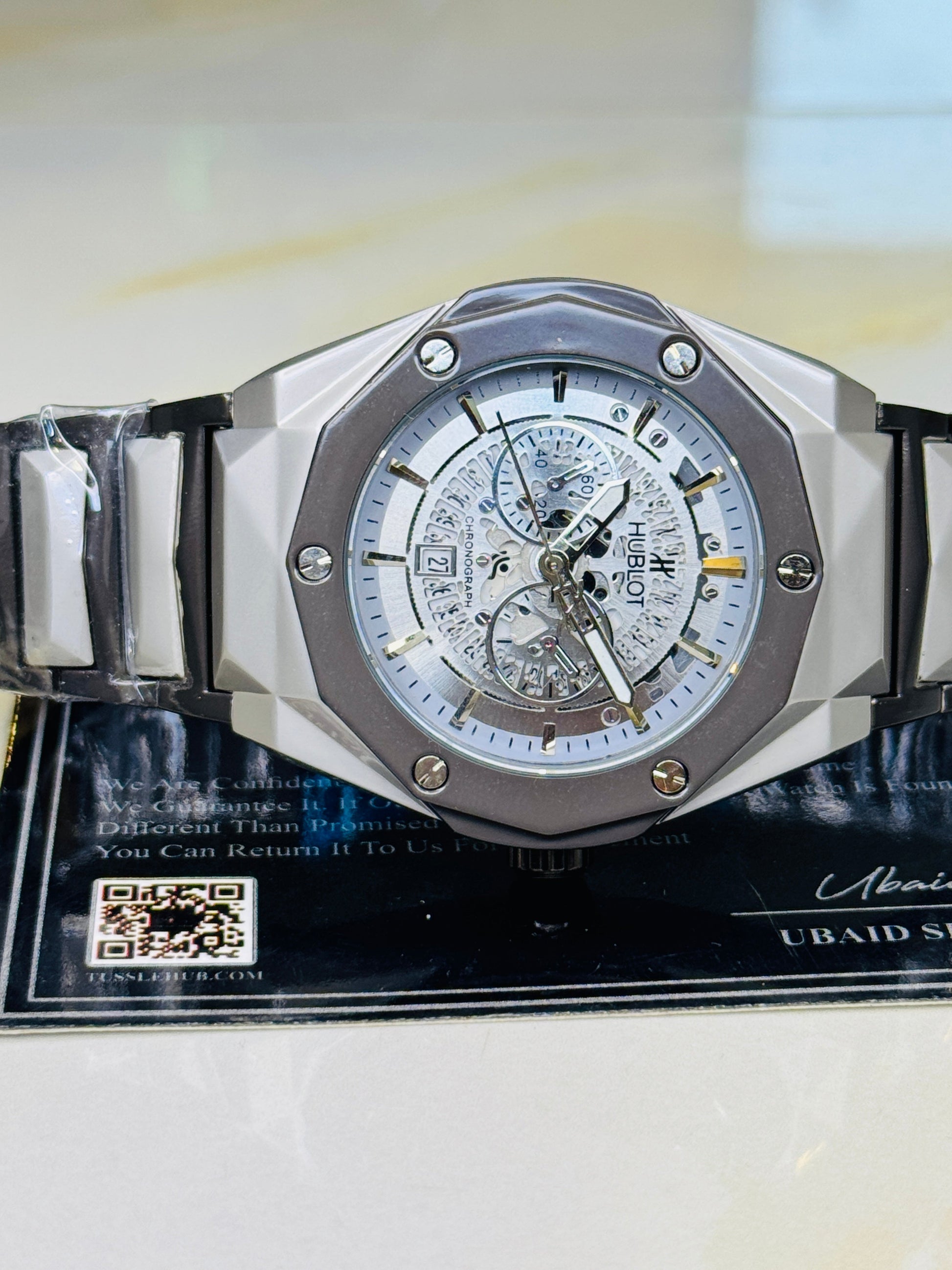 Two Tone Prism Chain Strapped Silver Hologram Dial Hublot Watch