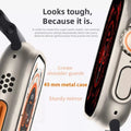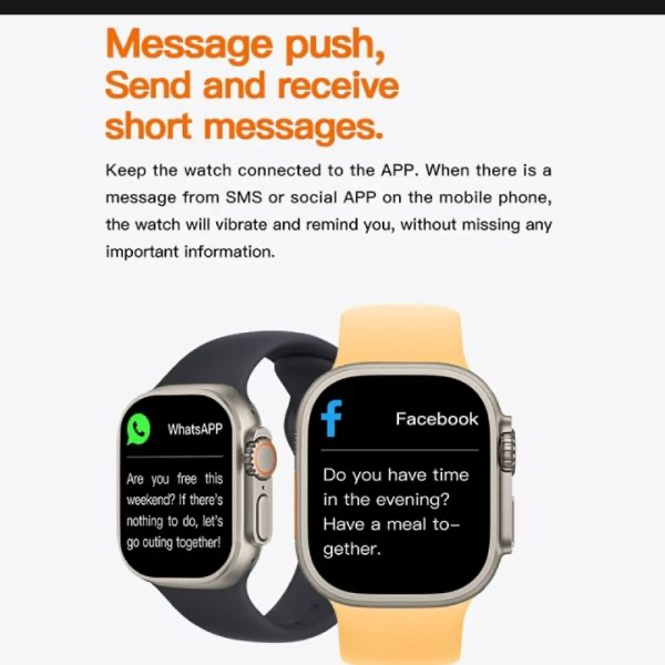 - CPU: RTL8763EDimension: 49*43*13.8mmShell: 1:1 Titanium alloy case with strap lock and real screwStrap: Standard silicone ocean strap, suitable for 44/45/49mm strapCharger: Wireless magnetic chargingWatch Color: Black, Orange, silver Screen: 1.99-inch HD LCD screen,425*518 resolutionSupport: Android 5.0+, I058.0+Battery: Lithium-ion polymer battery, 450mAhBluetooth: Dual Bluetooth.